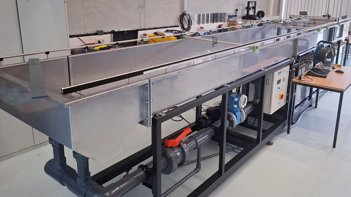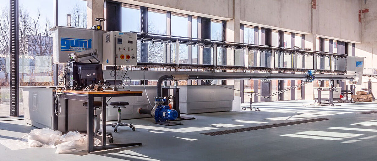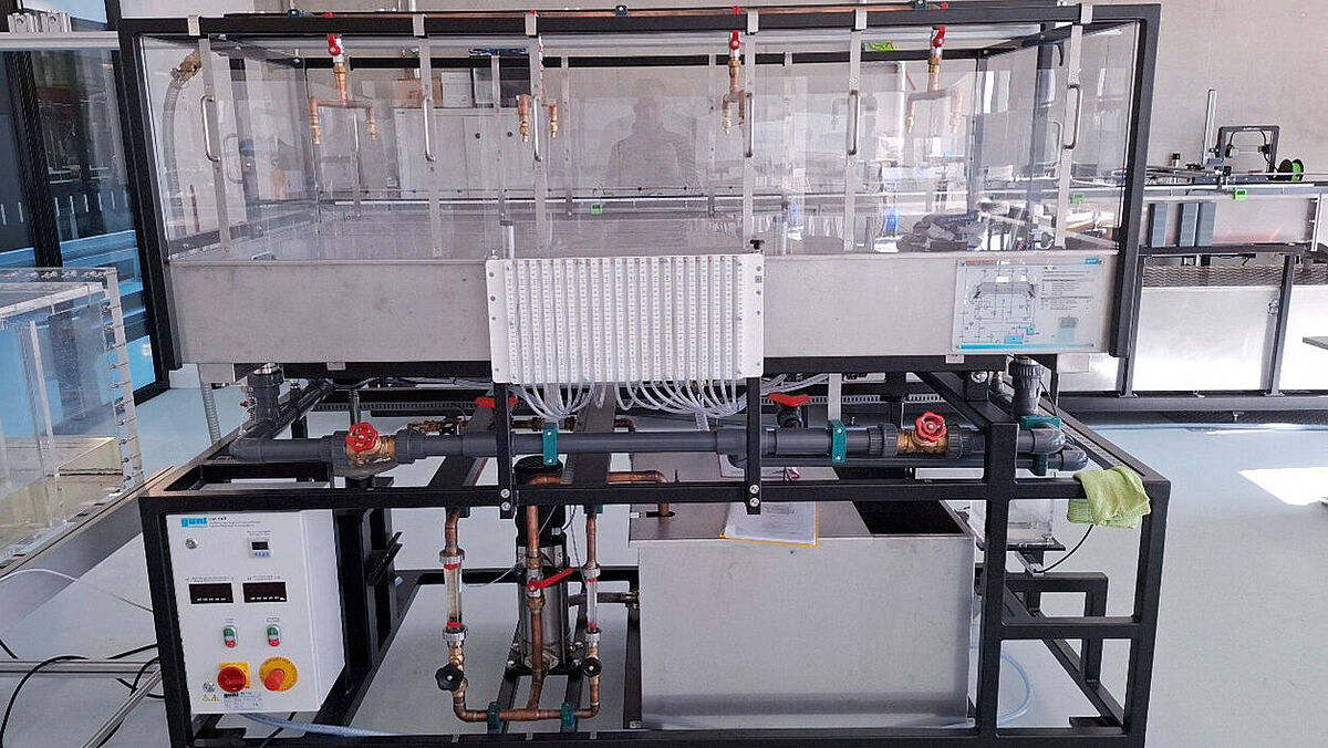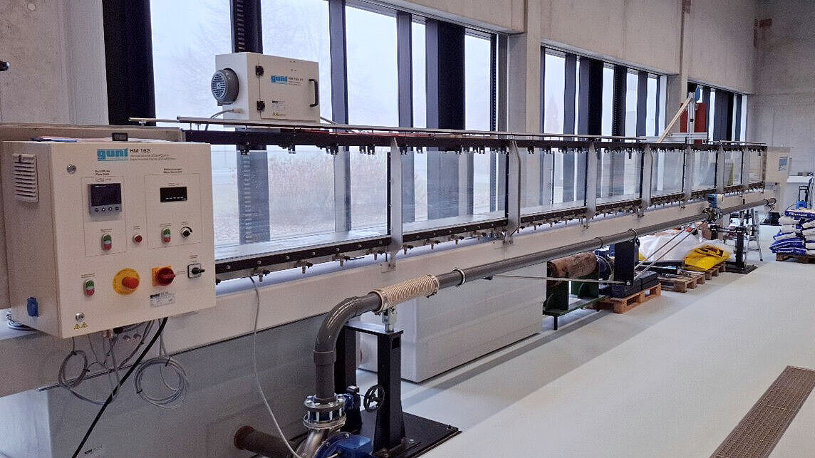 Mit dem Versuchsstand Sedimenttransport in Flussläufen werden Phänomene des Geschiebetransports im sohlnahen Bereich gezeigt. Die Abmaße der Versuchsstrecke erlauben das Modellieren von Flussläufen mit und ohne Bauwerke.