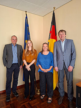 Die Geschäftsführerin der Deutschen Botschaft in Montevideo, Dr. Verena Frick (2. v. r.) hat gemeinsam mit der Kulturbeauftragten, Lena Peichl, die Professoren der Hochschule Wismar, Prof. Dr. Gunnar Prause (links) und Prof. Andreas Ahrens getroffen, um über das Potenzial der Zusammenarbeit mit Universitäten in den Bereichen nachhaltige Energie, Technologie und Seehandel zu sprechen.